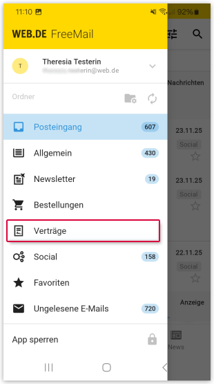 Tippen Sie in der Liste Ihrer E-Mail-Ordner unterhalb des Posteingangs auf Verträge.