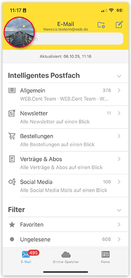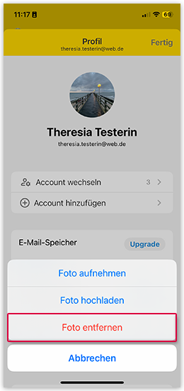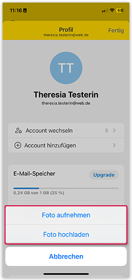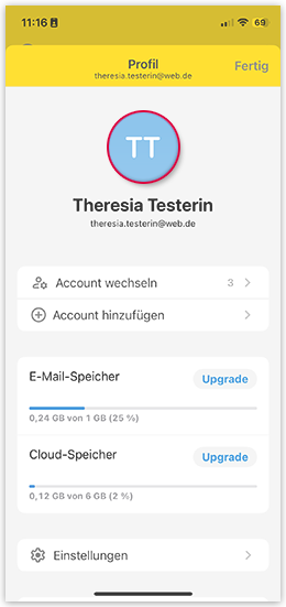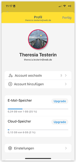 Sie haben die Möglichkeit, in der WEB.DE Mail App für iOS ein Profilbild hinzuzufügen. Das Profilbild hat unter anderem den Vorteil, Ihre Kontoen in der WEB.DE Mail App für iOS leichter unterscheiden zu können, wenn Sie mehrere nutzen.